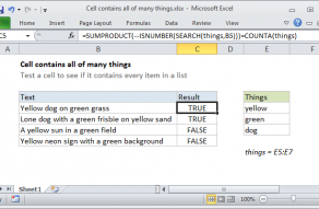 At the core, this formula uses the SEARCH function to look for multiple strings inside a cell. Inside the left SUMPRODUCT, SEARCH looks for all strings in the named range "include".