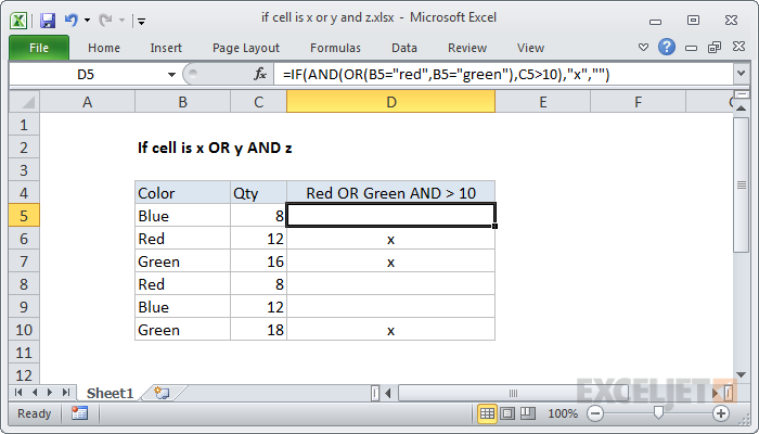 This formula returns "x" if the color in column B is "Red" or "Green", and the quantity in column C is greater than 10. Otherwise, the formula returns an empty string ("") which displays like an empty cell in Excel.